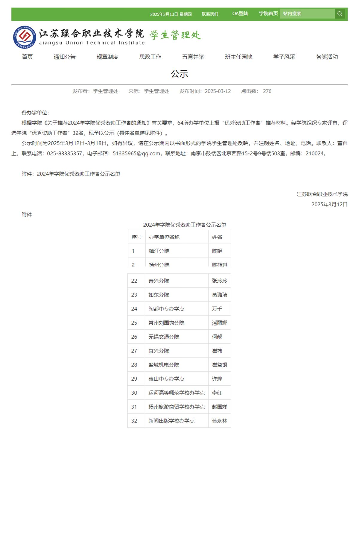 近日,我校学生管理服务中心张玲玲老师荣获联院2024年度“优秀资助工作者”荣誉称号。一直以来,我校高度重视学生资助工作,秉持“公平、公正、公开”原则,聚焦精准资助,坚持资助育人,探索发展型资助育人,将国家各项资助政策落到实处。今后,我校将进一步完善资助育人工作,持续探索和创新资助育人模式,将资助育人工作融入学生资助全过程,切实为学生成长成才提供坚强保障。