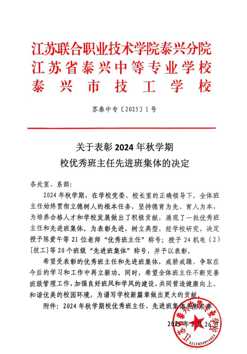 关于表彰2024年秋学期校优秀班主任先进班集体的决定