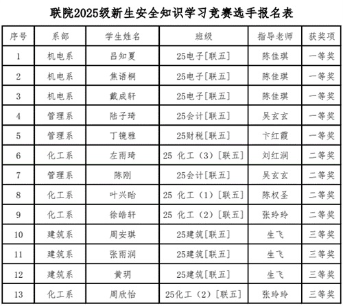为进一步推进学生安全教育,普及安全知识,提高学生安全防范意识和自我保护能力,根据《省教育厅办公室关于开展江苏省第十四届大学生安全知识学习竞赛的通知》(苏教办安函〔2025〕16号)精神,学校11月10日开展了2025级新生安全知识学习竞赛,共评选出一等奖5人、二等奖4人、三等奖4人。具体获奖名单见下表: