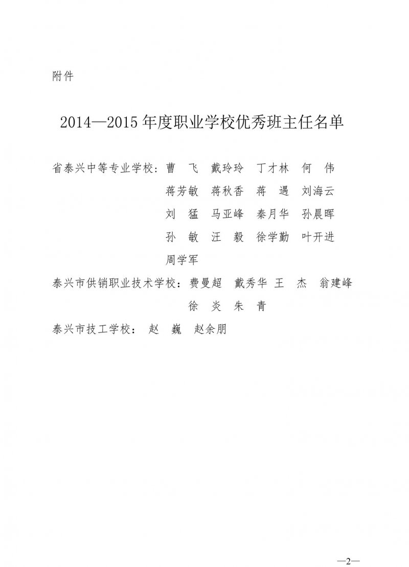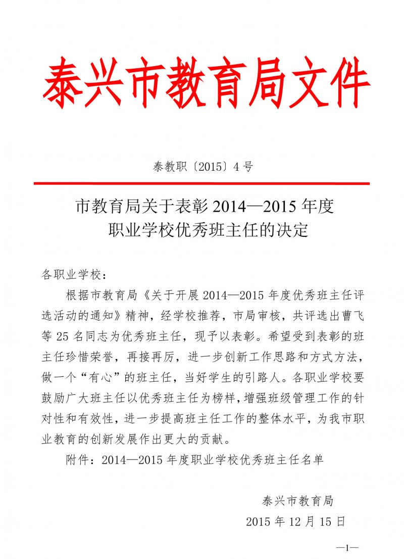 关于表彰2014—2015年度 职业学校优秀班主任的决定