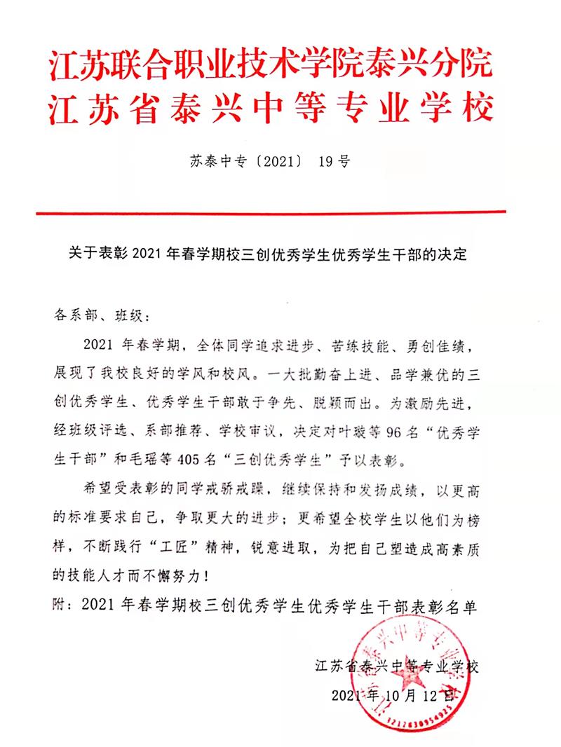关于表彰2021年春学期校三创优秀学生优秀学生干部的决定