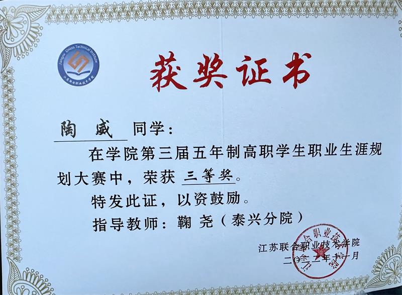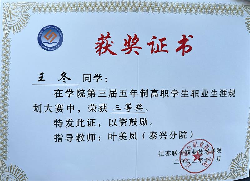 近日,在江苏联合职业技术学院举办的“生涯逐梦,职赢未来”第三届职业生涯规划大赛中,我校18建工联五的陶威(指导老师:鞠尧)和19建工联五的王冬(指导老师:叶美凤)两名同学经过学校层层选拔,获得参赛资格参加联院比赛,最终在联院比赛中均获得三等奖。