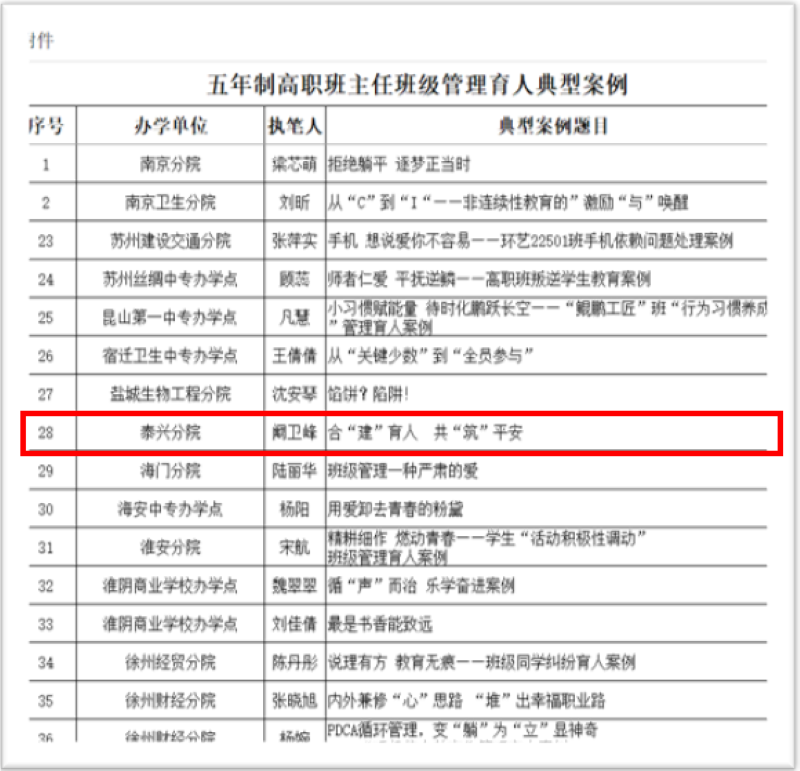 根据学院《关于公布五年制高职班主任班级管理 育人典型案例的通知》,我校阚卫峰老师撰写的《合“建”育人 共“筑”平安》案例,经通泰片区组推荐和学院专家评审,成功遴选学院班主任班级管理育人典型案例。