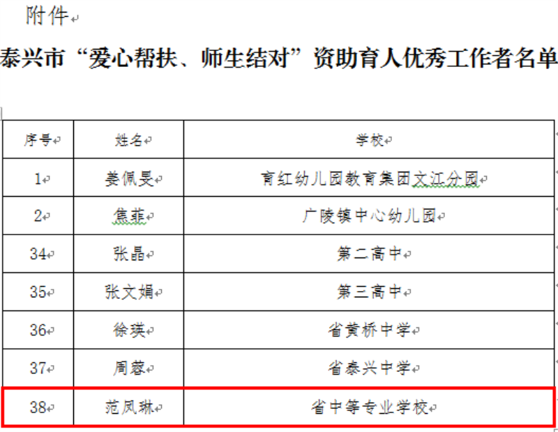 附件:/泰兴市教育局关于公布“爱心帮扶、师生结对”资助育人优秀工作者评选结果的通知.doc