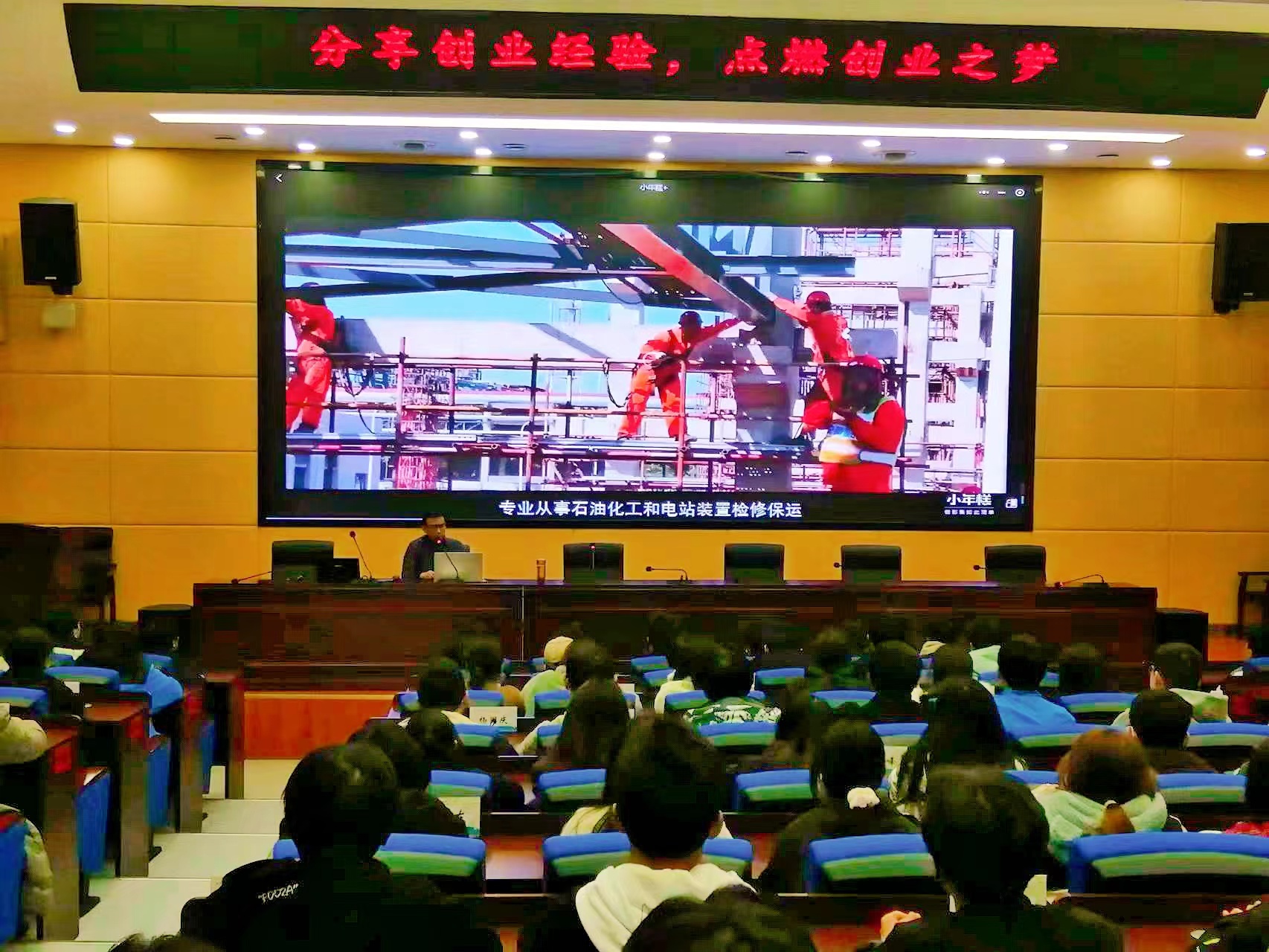 11月23日,学校成功举办本学期创业就业第二场讲座。此次我们邀请到化工开发区优秀企业高管盈创石化检修有限责任公司的经理杨华东前来开设讲座。学生管理服务中心主任施文龙、机电系学工主任蔡兴华和近百名学生共同参与了此次主题讲座。