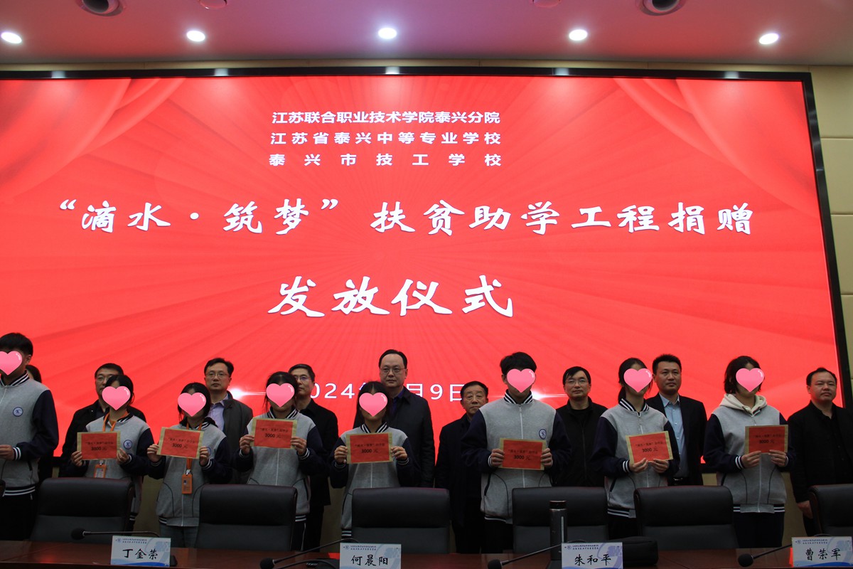 学习成就梦想,爱心点燃希望。4月9日下午,我校在知行厅举行了“滴水·筑梦”扶贫助学工程捐赠发放仪式。泰兴市扶贫“三会”办公室主任朱和平,我校校长何晨阳、校党委副书记丁金荣、副校长曹荣军、周勇、苏辉,团委书记杨巧珍及2023级受助的100名学生参加了此次仪式。仪式由学工处主任施文龙主持。