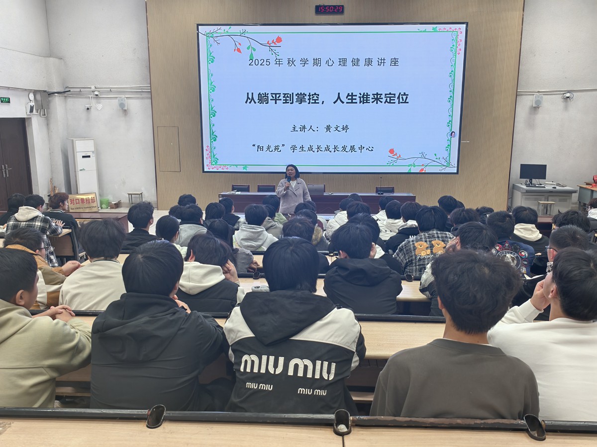 为帮助学生破解成长困惑,摆脱心理内耗,树立积极向上的人生态度,我校于2025年11月12日下午面向机电系学生举办了以“从躺平到掌控,人生谁来定位”为主题的心理健康讲座,此次讲座由学校专职心理健康教师黄文婷主讲。