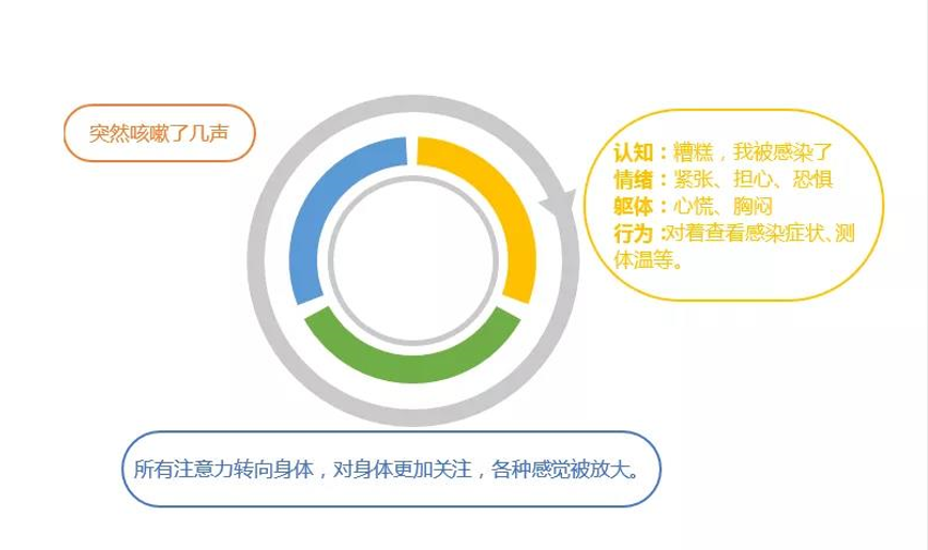 认知方面:可以出现注意力不集中,总觉得自己可能被感染,对身体各种感觉特别关注,并将身体的各种不舒服与“疫情”联系起来。觉得生活中充满各种各样的危险并随时可能发生、生命如此脆弱、难以相信他人和世界等。