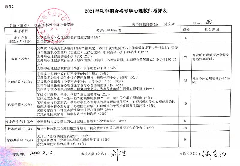 公示:专职心理教师考评表