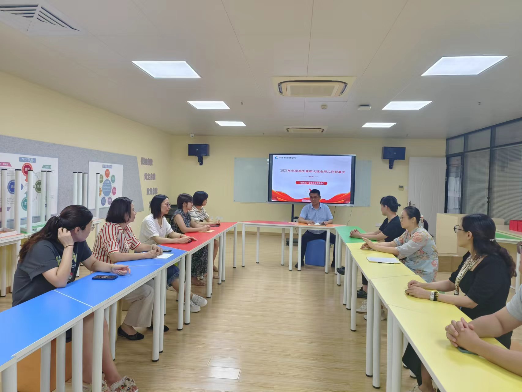 为确保2023年秋学期学校心理健康教育工作有序有效开展,9月6日上午,江苏省泰兴中等专业学校“阳光苑”学生成长发展中心召开了全校心理健康教师工作会议,学工处施文龙主任及学校全体心理健康专兼职教师参加了此次会议。