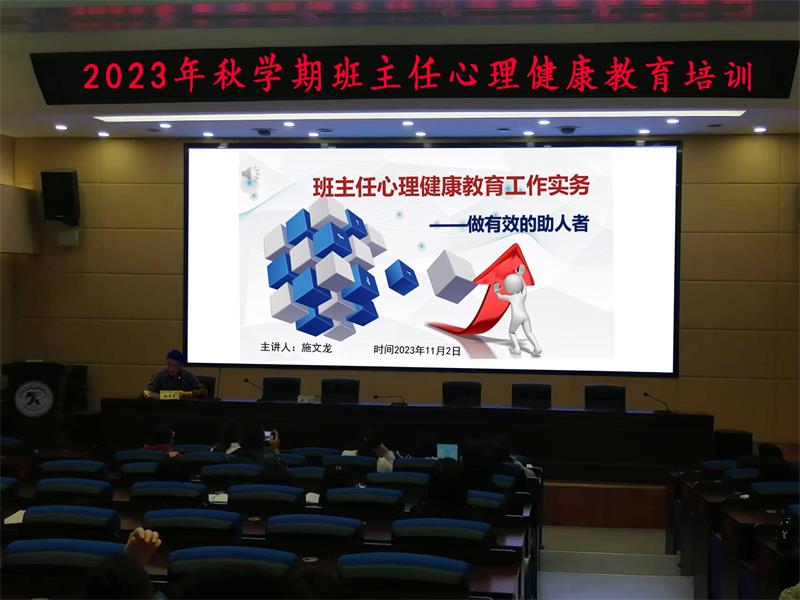 为提高班主任综合素质,推进班主任心理健康教育水平,11月2日,学校在知行厅组织全体班主任开展了“班主任心理健康教育工作实务”主题培训。培训由学生成长发展中心三级心理咨询师施文龙老师主讲。