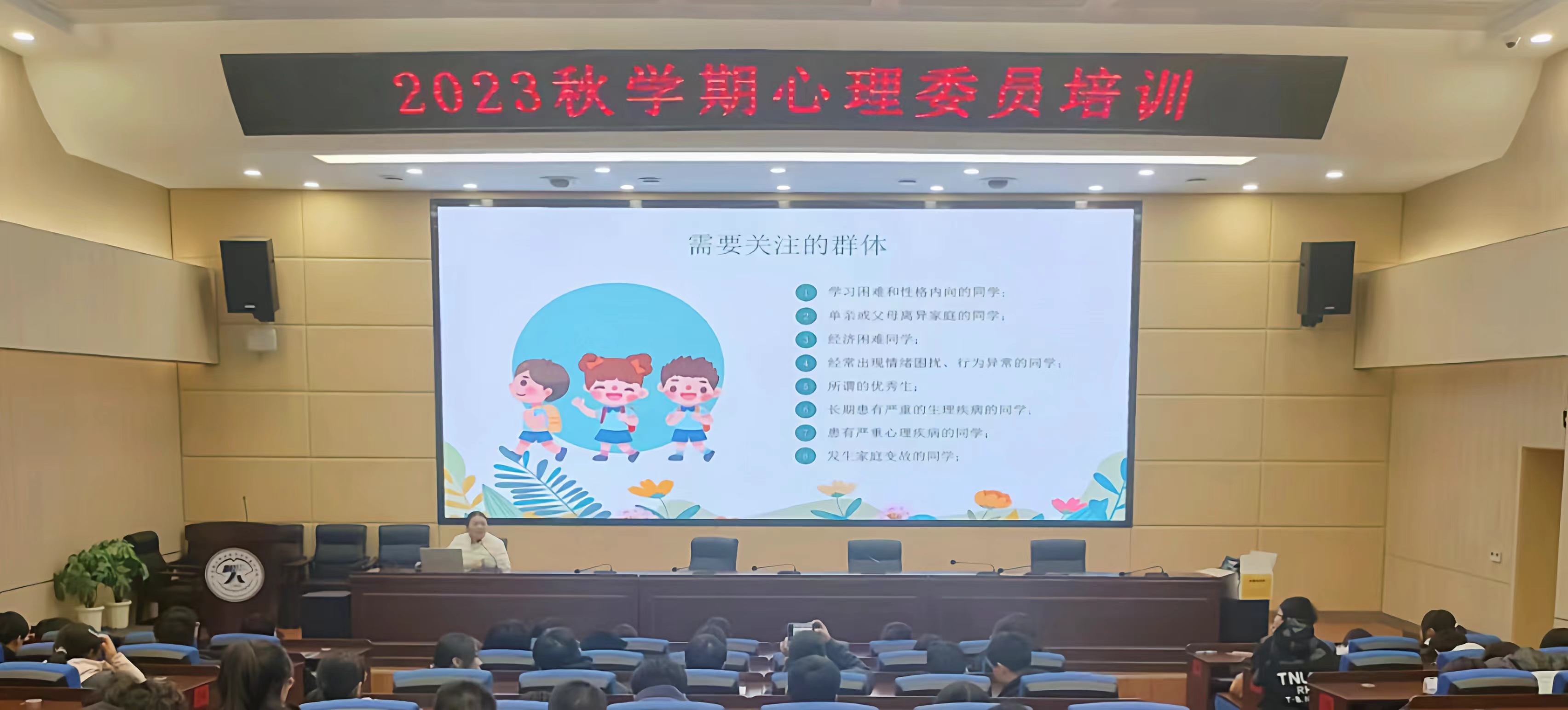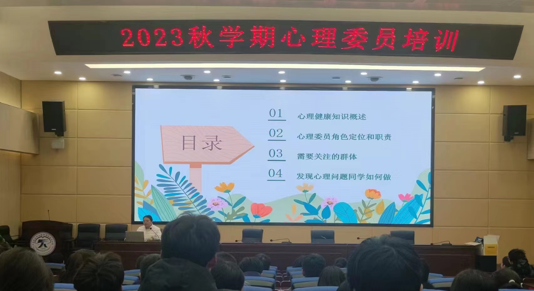 本次培训从“一、心理健康知识概述;二、心理委员角色定位和职责;三、需要关注的群体;四、发现心理问题,同学们如何做?”四个方面展开,建议心理委员要主动关心心理异常同学,给予他们情感和生活上的支持与帮助。