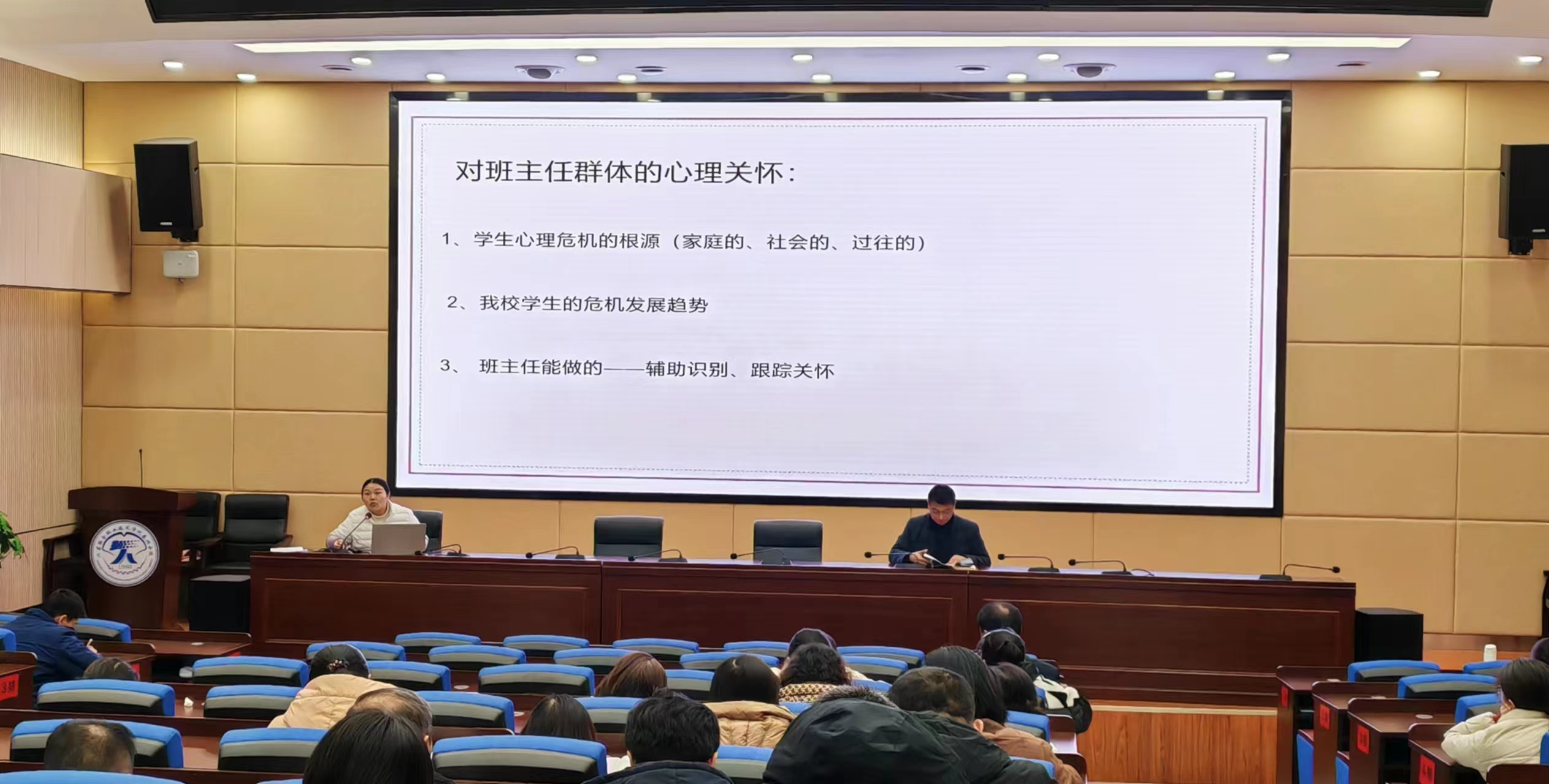 为帮助心理危机学生平稳度过危机阶段,切实提升班主任处理危机的能力水平,做到有效预防学生心理危机事件发生,12月8日下午,我校召开了“关爱心理危机学生”工作专题会议,校领导、班主任和心理健康老师参与了本次会议。