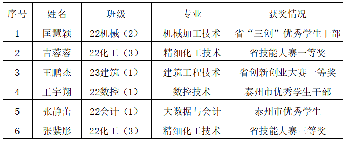 根据《中等职业教育国家奖学金评审办法》(教财〔2023〕11号)和《省教育厅关于做好2024年中等职业教育国家奖学金有关工作的通知》精神要求,经过个人申请、班级推荐、系部筛选、学校评审,确定匡颖慧等6名同学获得中等职业教育国家奖学金,现公示如下: