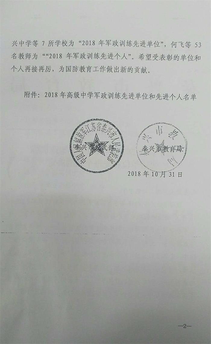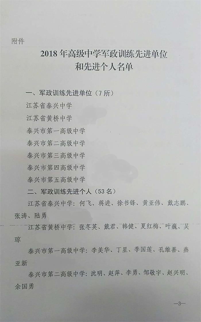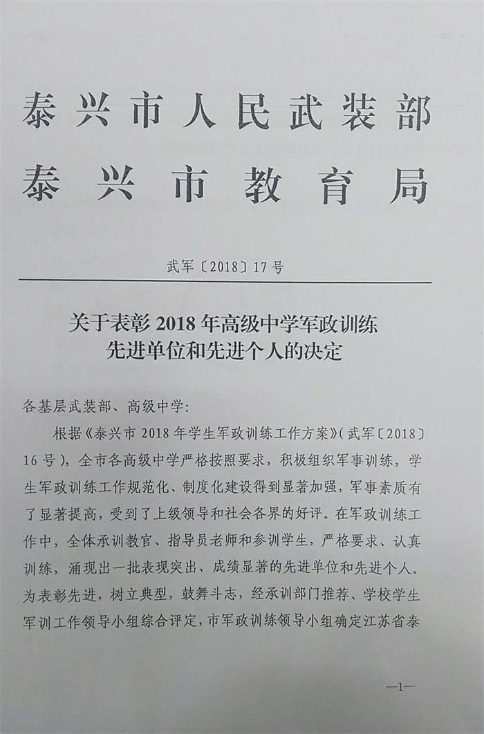 关于表彰2018年泰兴市军政训练先进个人的决定