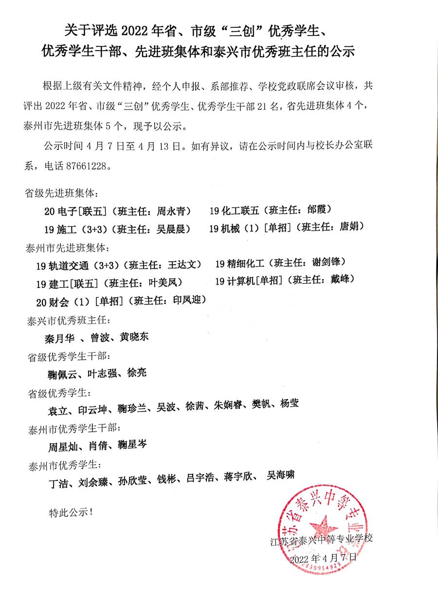关于评选2022年省、市级“三创”优秀学生、 优秀学生干部、先进班集体和泰兴市优秀班主任的公示