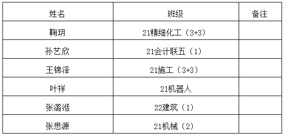 根据《中等职业教育国家奖学金评审暂行办法》(教财函〔2019〕104号)和《省教育厅关于做好2023年中等职业教育国家奖学金有关工作的通知》(苏教助函〔2023〕7号)精神要求,经过个人申请、班级推荐、系部筛选、学校评审,确定鞠玥等6名同学获得中等职业教育国家奖学金,现公示如下: