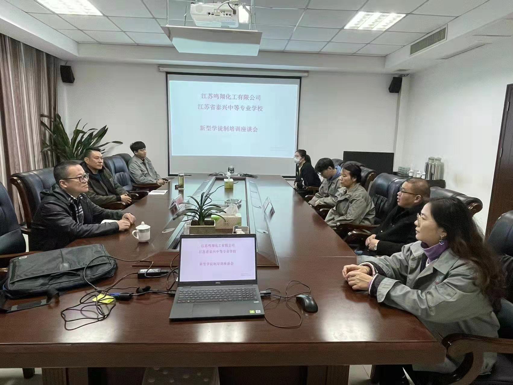 2022年11月29日上午,学校社会服务中心主任夏国文赴江苏鸣翔化工有限公司开展新型学徒制培训校企座谈会,江苏鸣翔化工有限公司厂办主任严俊及相关培训人员参加,会上严主任表示经过一段时间的培训,参培员工掌握很多新的化工理论知识、具备技术总结撰写知识和事故预案编写知识、会用专业知识指导解决生产岗位中的实际问题等新技能,企业产能得到较大的提高。座谈会上校企双方还就下一步如何更有效开展培训进行了协商。