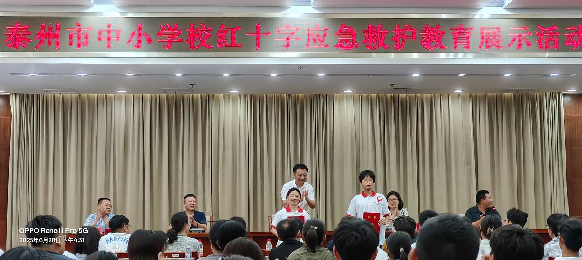 2025年6月28日,我校教师:樊琦、冷亮、林亮、王绍裘,我校学生:丁佳鑫、钱艺钧、吴蕊、黄荣华,在泰州市教育局参加泰州市中小学红十字应急救护教育展示活动,我校师生表现优异荣获泰州市团体赛一等奖!
