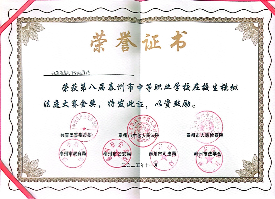 近日,第八届泰州市中等专业学校在校生模拟法庭大赛(决赛)在海陵区人民法院落下帷幕。我校参赛团队凭借出色的庭审表现与默契的团队协作,从全市多所中职学校的队伍里“杀出重围”,成功斩获金奖。