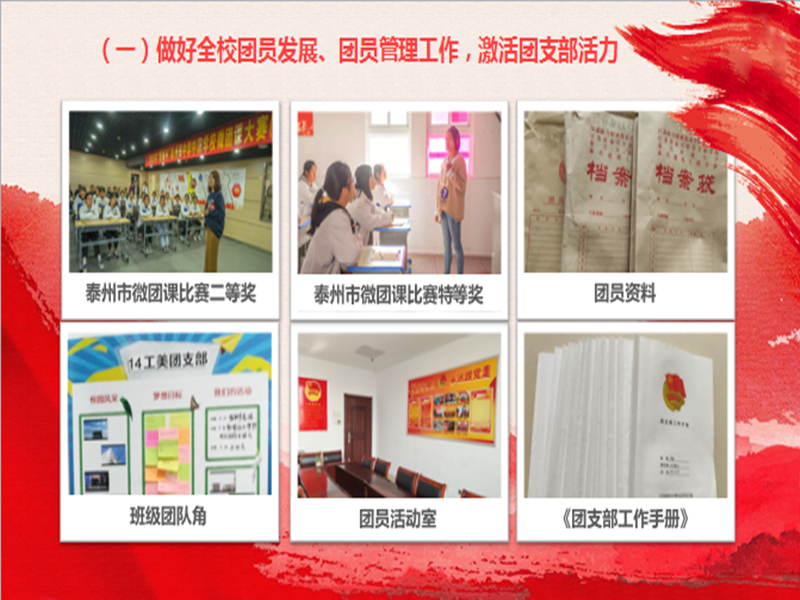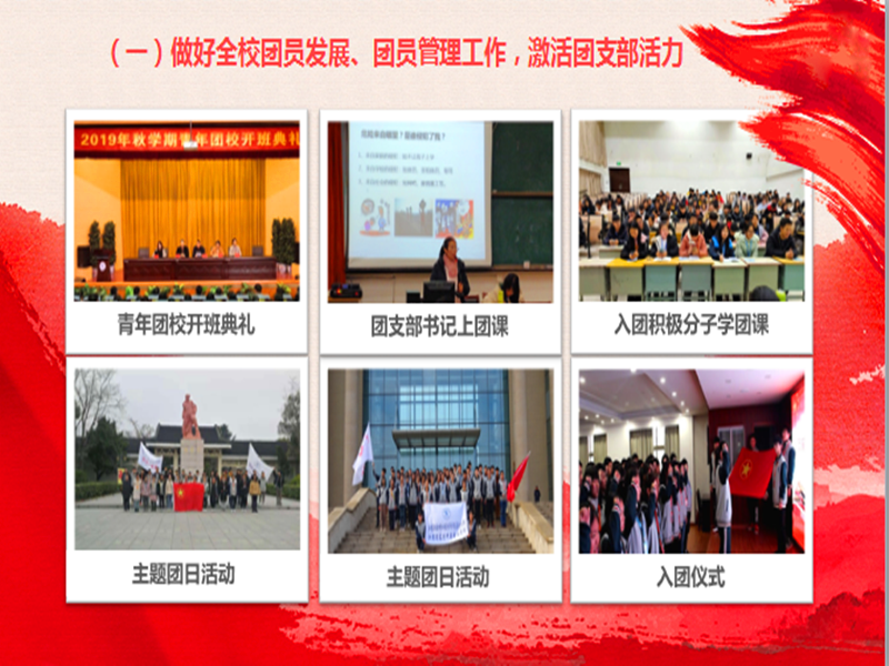 一年以来,新一届团委班子在学校领导和上级团组织的领导和关心下,在各部门的支持和帮助下,全面落实学校中心党政和上级团委各项工作部署,团结带领全校团员青年积极向上,锐意进取,充分发挥团员青年先进带头作用,围绕学校中心工作,深入开展了一系列活动,营造了良好的校园文化氛围。现将校团委年度工作总结如下: (一)做好全校团员发展、团员管理工作,激活团支部活力 2019年度校团委共发展199名学生团员,严格按照“三公示六必须十步骤”的要求开展团员发展工作。在团员管理方面,通过《团支部工作手册》进一步规范团员组织生活。每个团支部按时完成“三会两制一课”,积极开展团队活动,3月份,校团委带领各班团支书到黄桥纪念馆开展“探寻英雄足迹Ÿ感受红色文化”主题团日活动;12月份,开展“不忘初心跟党走”主题团日活动。通过“智慧团建”系统完善团员身份信息,做好新发展团员信息录入和毕业生档案接转工作。2019年度共评选出34个优秀团支部,若干名优秀团干部和优秀团员。