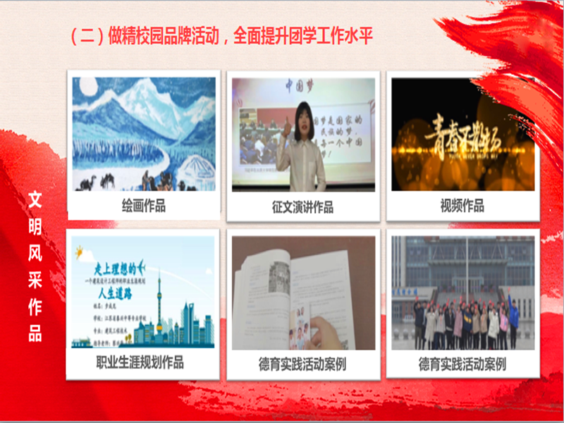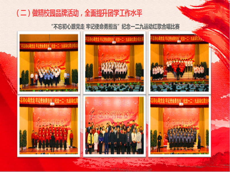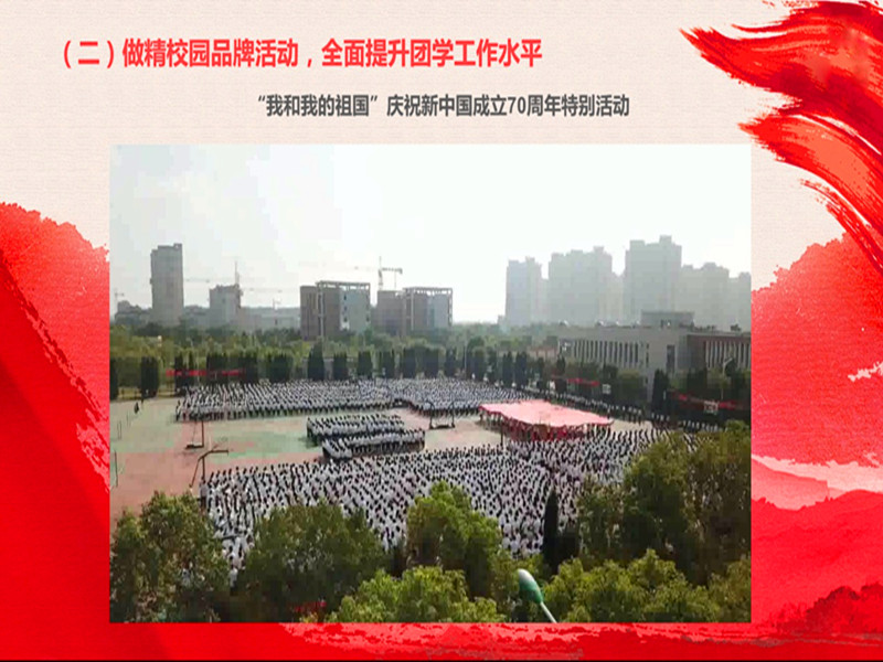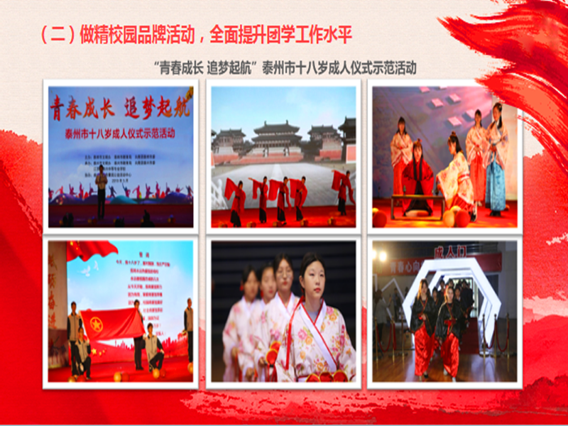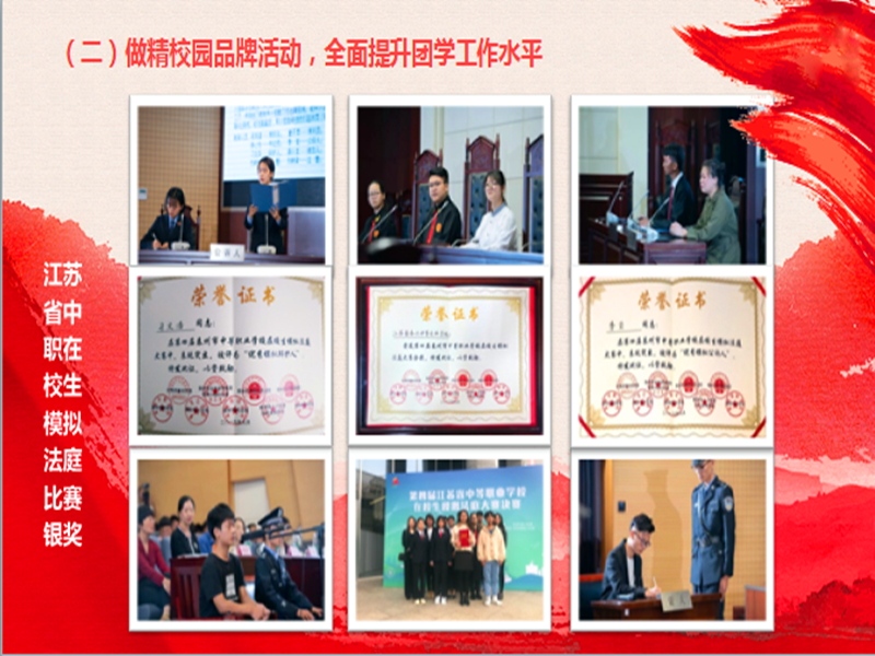 ![]() ![]() (二)做精校园品牌活动,全面提升团学工作水平 春学期的特色品牌活动为3月份的“文明风采”活动、5月份的“青春成长Ÿ追梦起航”十八周岁成人仪式和6月份的班级社团成果展。秋学期的特色品牌活动为9月份的“我与祖国共奋进”庆祝新中国成立70周年活动、11月份的江苏省中等职业学校在校生模拟法庭比赛和12月份的“不忘初心跟党走,牢记使命勇担当”纪念一二九运动红歌合唱比赛。