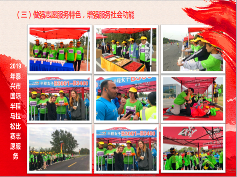 ![]() (三)做强志愿服务特色,增强服务社会功能 弘扬志愿服务精神,深化志愿服务活动。“青春红丝带”志愿者服务队在万达广场、泰兴市图书馆、等地广泛开展了“志愿讲解员”、“交通引导员”、“关爱留守儿童”等志愿活动。在2019年江苏省大中专学生志愿者暑期文化科技卫生“三下乡”社会实践活动中被评为“优秀团队”。2019年10月27日,泰兴市举行国际半程马拉松比赛,我校共有941名师生担当志愿者,在起点区、赛道补给区、终点区等区域进行检录、发放补给、医疗救助等志愿服务。