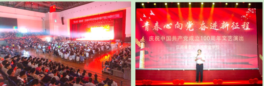 演出前,学校党委副书记、校长何晨阳致辞。他说,全校师生隆重集会,共同庆祝党的百年华诞,希望同学们紧紧跟随党的脚步,树立远大理想,担负时代责任,传承红色基因,塑造工匠气质,做一个有信仰、有担当的新时代青年。全体教职工从党史中汲取干事创业的智慧与力量,勠力同心、全面推进江苏省领航学校建设和学校高质量跨越式发展。