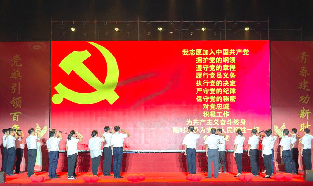 在演出中,全校党员重温入党誓词。面对鲜红的党旗,全体党员一起高举右手,再次庄严宣誓。“我志愿加入中国共产党……随时准备为党和人民牺牲一切,永不叛党。”铿锵恢宏的誓词,强烈震撼着在场师生,一字一句,神圣而豪迈,体现了党员同志们对中国共产党的无限忠诚。