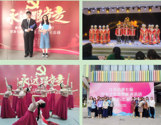 3. 5月25日,我校学生参加“永远跟党走”泰兴市第七届中小学生艺术展演活动,以文艺演出为媒,向党献礼。经过前期的动员和选拔,我校共选送五个作品参加本次活动。分别是:朗诵社团《红辫子》、合唱社团《大地飞歌》、花鼓社团《泰兴花鼓》、舞蹈社团《活着1937》和《灯火里的中国》。最终《红辫子》、《大地飞歌》、《活着1937》均获得高中组第一名。其中舞蹈《活着1937》在11月20日举行的第七届江苏省中小学生艺术展演活动中获得舞蹈组二等奖的好成绩。