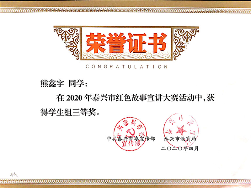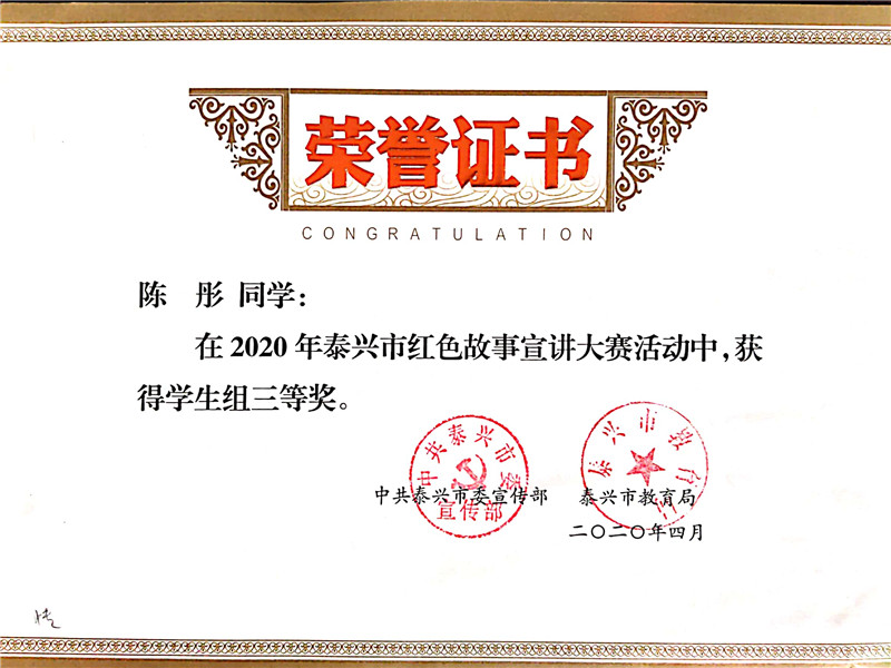 我校师生在泰兴市委宣传部、泰兴市教育局联合举办的2020年泰兴市红色故事宣讲比赛中获奖。