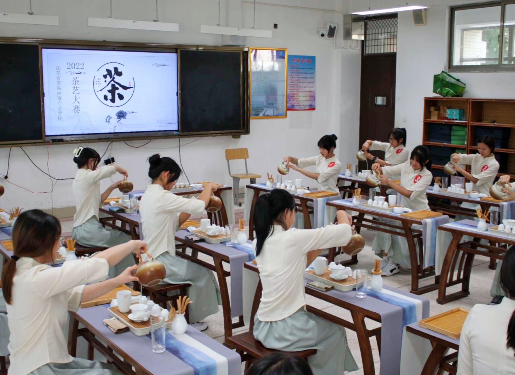 为进一步丰富我校同学们的校园生活,陶冶同学们的文化修养内涵,弘扬我国优良传统文化。9月29日在学校茶艺实训室举行2022年茶艺展示比赛,经过选拔共有14位学生参加。