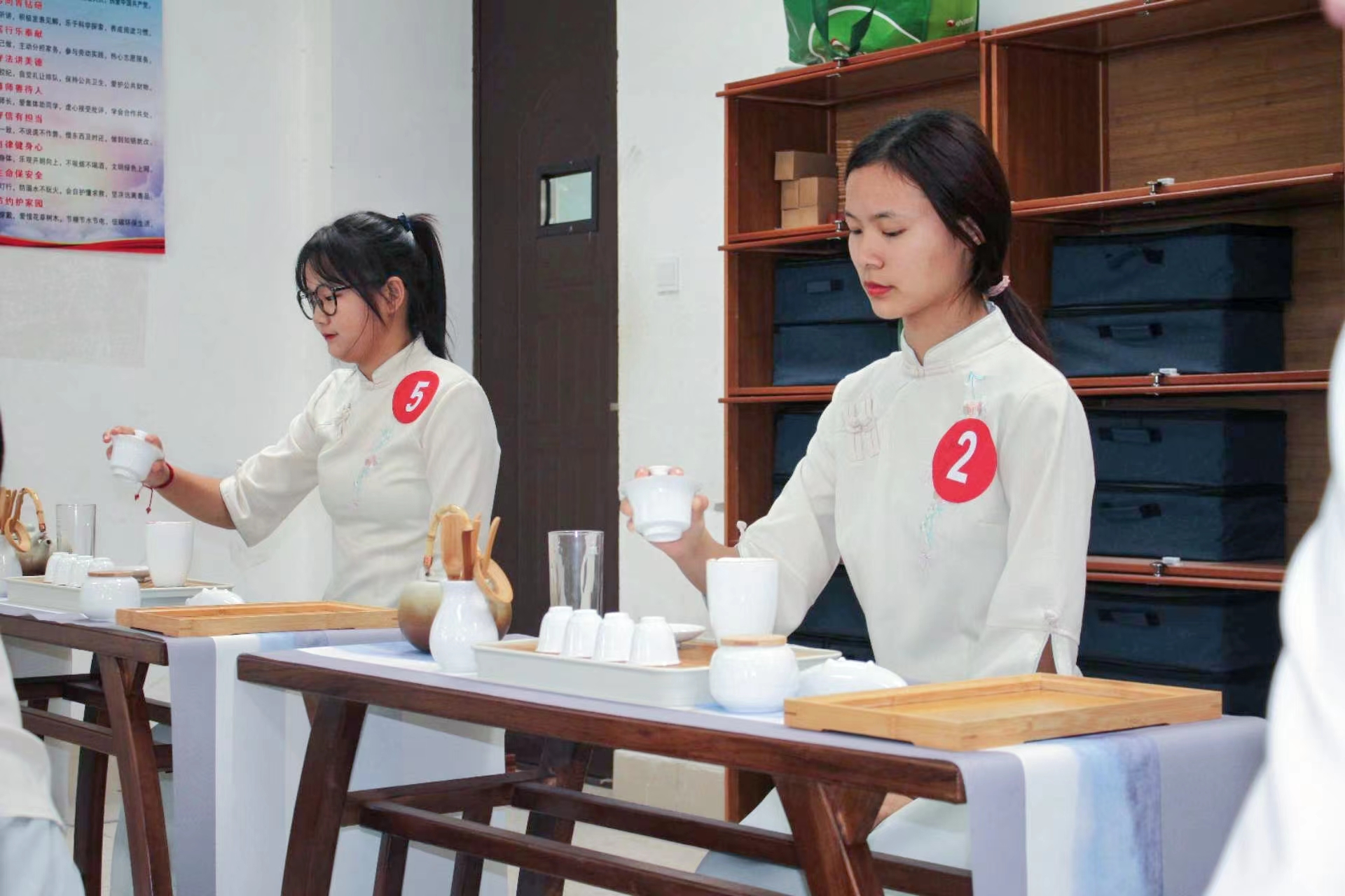 清幽曼妙的环境,古色古香的服饰和举手投足的优雅和谐地融合在一起,宛如一幅水墨画,令经过的同学们不禁驻足欣赏,参与到活动中来。比赛中选手们在各个环节均展示了属于自己的风采,着实让人眼前一亮,享受其中。最终来自20酒店服务班的朱锦秀同学获得第一名。