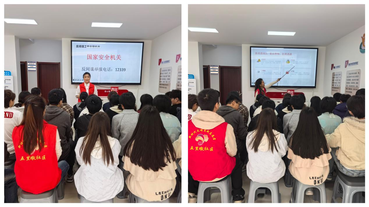 活动现场,社区志愿者围绕《反间谍法》展开宣讲,解读网络间谍、数据泄露等新型安全风险,讲解境外势力诱导泄密的常见套路与防范要点,并普及12339国家安全机关举报受理电话,引导同学们树立“国家安全无小事,青年有责勇担当”的理念。