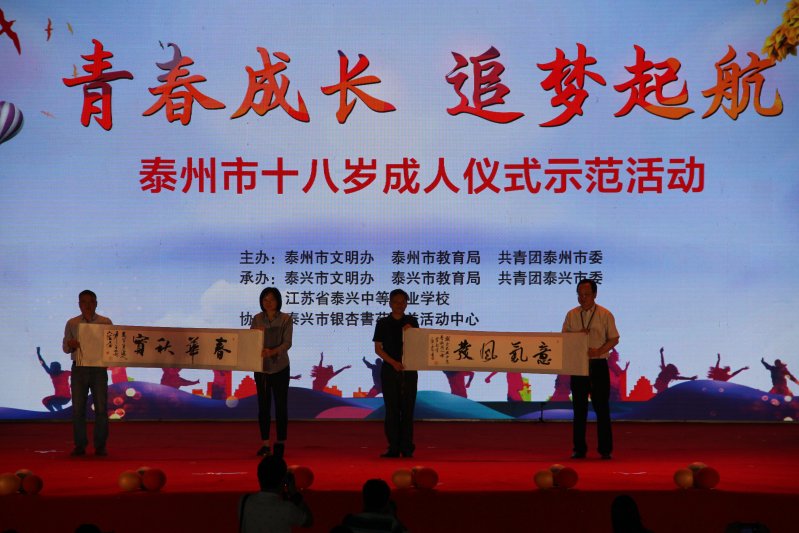 在《追梦•创未来》环节,同学们一起通过视频学习习总书记对当代青年的寄语,欣赏了诗朗诵《少年中国说》。人生新篇章即将打开,带着几分欢喜和雀跃,又有几分忐忑和期待,2017级工艺美术班的学生代表熊蔚一表达感恩,感谢父母给予了她生命并含辛茹苦将她养育长大,感谢老师孜孜不倦的教导让她更加睿智和成熟,感谢学校和社会的呵护让她对未来充满信心。 在《追梦•创未来》环节,泰州市文明办副主任刘文杰、泰州市团市委副书记唐晶为我校捐赠书法作品,“春华秋实,意气风发”8个字表达了对我校及同学们的祝愿。泰兴市委宣传部副部长、市文明办主任卞维国、泰兴市教育局副局长董泽华、泰兴市团市委副书记蒋宇、泰兴市银杏书苑公益活动中心发起人江玲为学生代表赠书。随后,同学们迈着矫健的步伐一同走过“成人门”“校门”和“国门”,在铿锵有力的成人宣誓后,这标志着他们的人生正式掀开新的一页,用青春的激情继续谱写生命中新的篇章!