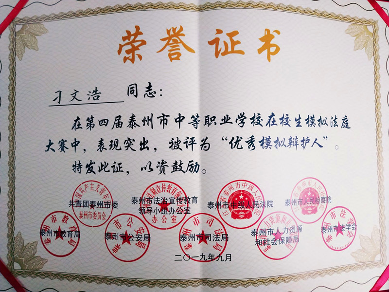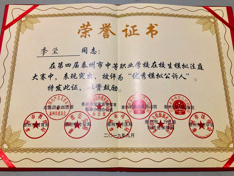 ![]() ![]() ![]() ![]() ![]() 9月26日,第四届“泰州市中等职业学校在校生模拟法庭大赛”在泰州市中级人民法院落下帷幕,全市7支代表队参加了大赛。最终,我校代表队斩获此次大赛金奖。 为筹备参加本次大赛,校团委组织选拔了全校优质的学生力量参加培训。 在机电系学工主任蔡兴华老师的倾情指导和大力支持下,师生们积极备赛,为了最佳效果,他们想了很多办法,向身边能请到的专家请教,多看往届获奖视频,获得灵感与经验,不断进步,常常废寝忘食。功夫不负有心人,这次大赛,从八点开始,经过一天的紧张而激烈的角逐,我校代表队打败了夺冠热门的代表队,最终稳收大赛金奖。 大赛中,同学们表现优异,充分展示了我泰兴中专学子的精神风貌,其中,16财会【联五】季莹同学荣获“优秀模拟公诉人”称号,16建工【联五】刁文浩同学荣获“优秀模拟辩护人”称号。 同学们拿下泰州金奖,非常兴奋,他们激动而满怀壮志地说,我们将保持劲头,积极准备省赛,下一步,争取在省级大赛中再取得一个历史性的突破,冲击大奖!我们全校师生为他们骄傲,给他们加油,预祝他们愿望成真,为校争光!