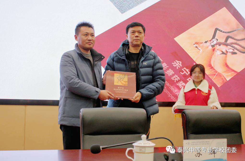 讲座开始前,余宁台主席代表泰兴市摄影家协会向我校馈赠图书:《寻梦天涯——余宁台摄影作品集》和《余宁台国际影赛获奖作品集》。