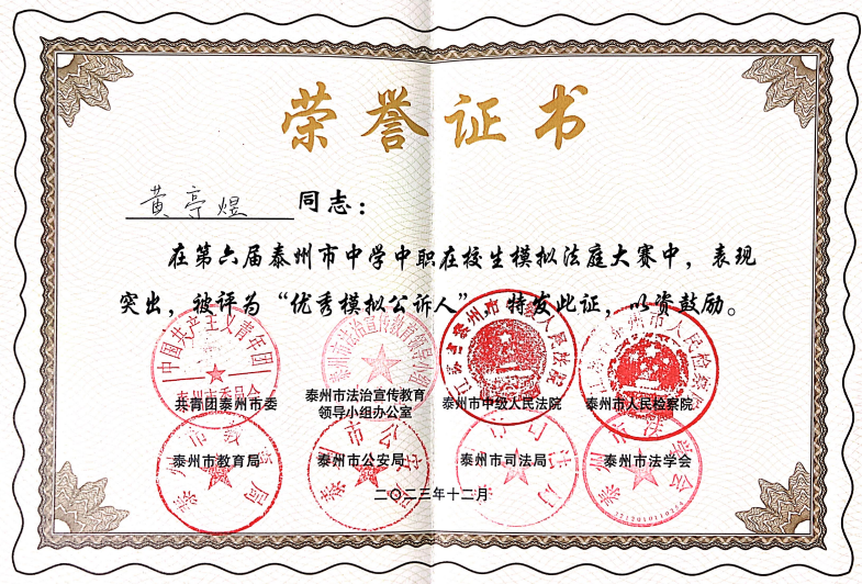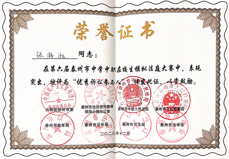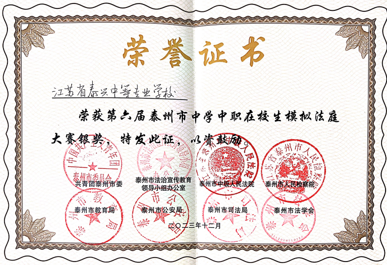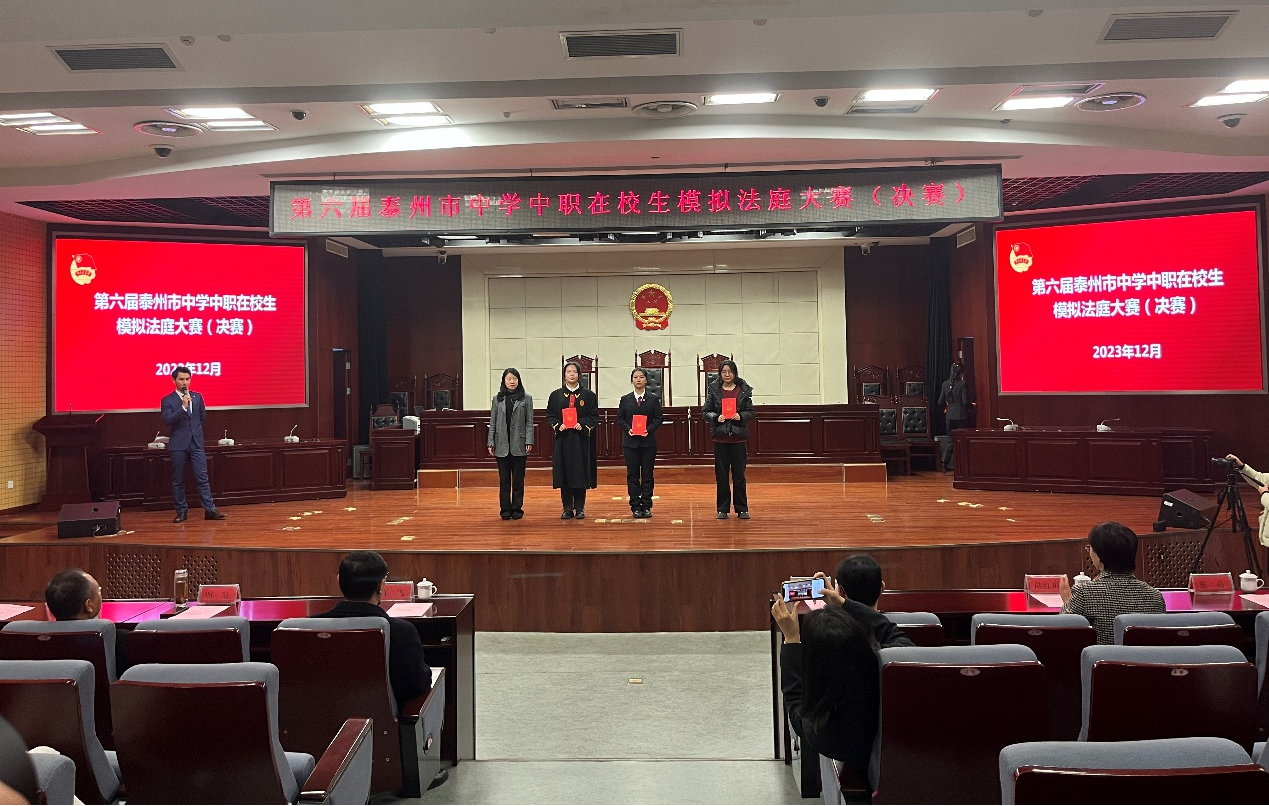 12月1日,第六届泰州市中学中职在校生模拟法庭大赛(决赛)在泰州市中级人民法院举行。本次比赛旨在模拟真实的法庭场景,让同学们通过扮演法官、律师等角色,亲身体验法庭的庄严和公正,提升自身的法律意识和法律素养。经过激烈角逐,我校代表队凭借出色的表现,荣获了本次比赛的第二名。扮演公诉人的黄亭煜同学被评为“优秀模拟公诉人”,扮演人民陪审员的张潞湉同学被评为“优秀诉讼参与人”。