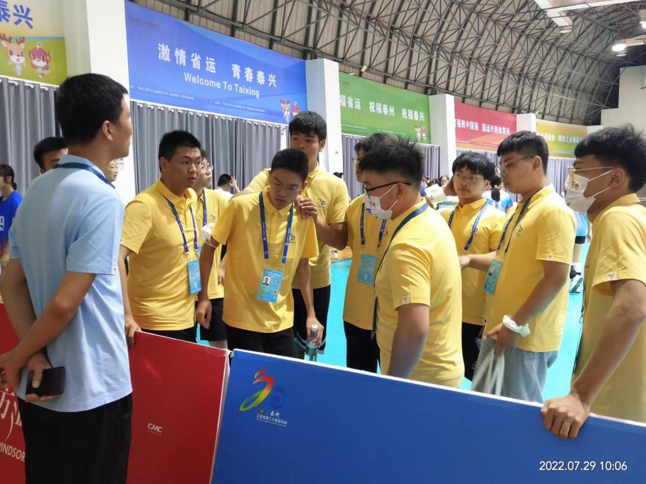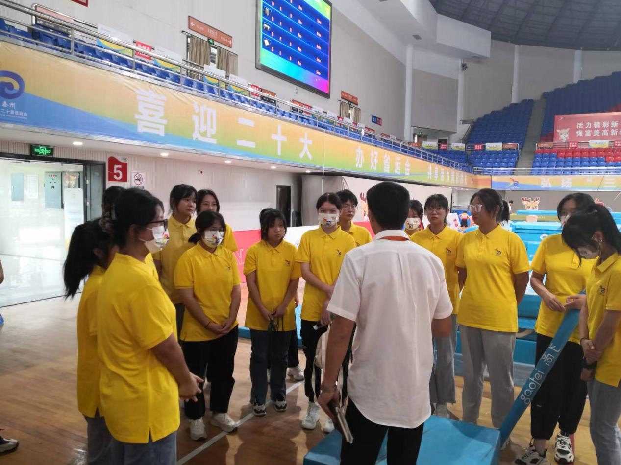 2022年7月19日上午九点,江苏省第二十届省运会泰兴赛区于泰兴体育馆举行赛事开幕式。本次省运会,泰兴赛区承办少儿体适能、体操、艺术体操、排球、男女足球等五个项目的比赛,整个活动于2022年9月4日落下帷幕。为了协助本次赛事圆满举办,我院响应团市委和体育局的号召,积极组织学生报名参加赛事志愿者服务。