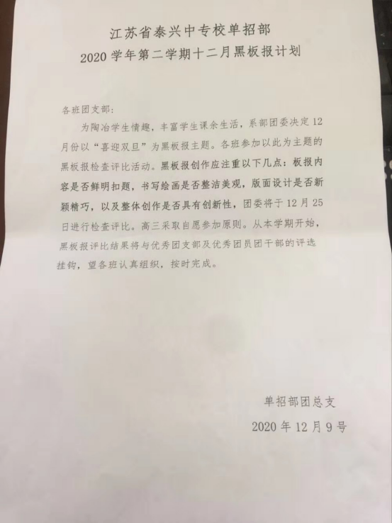 江苏省泰兴中专校单招部 2020学年第二学期十二月黑板报计划