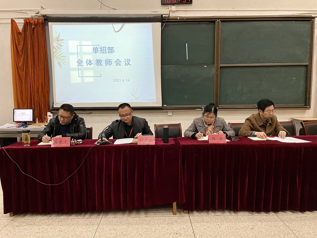 单招部于4月14日下午4点召开全体教师会议。会议主持由叶开进,陆美,蒋赛虎,钱来富主任主持。