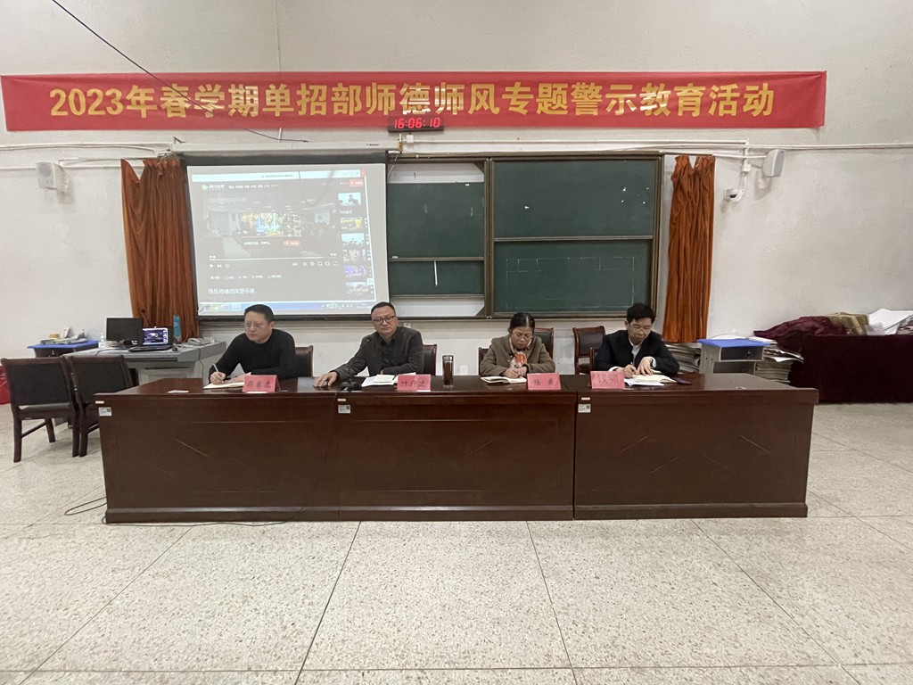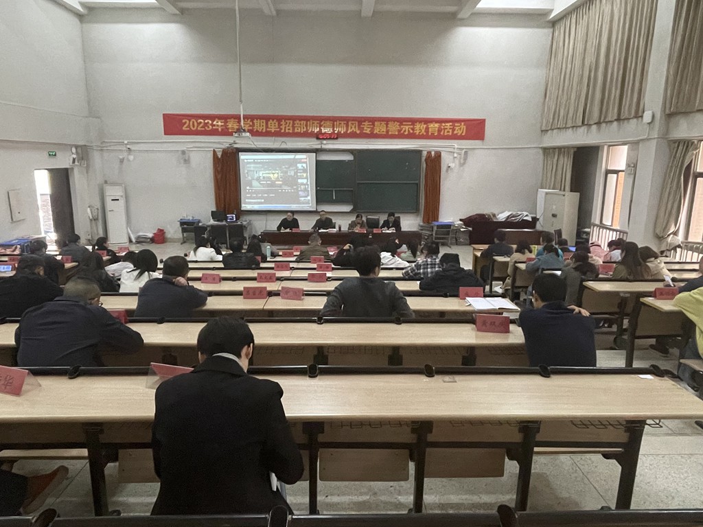 为加强教师师德师风建设,提高教师思想政治素质和职业道德水平,增强教师的职业责任感、使命感和荣誉感,促进教育事业的健康发展。根据学校文件精神,结合部门实际情况,单招部于2023年4月12日下午四点召开了单招部师德师风专题警示教育活动。