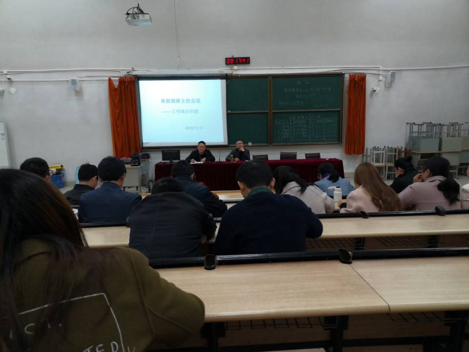 11月17日上午单招部在六号楼阶梯教室召开班主任会议,就创建文明城市的准备工作作部署。 会议由单招部叶开进主任主持,蒋赛虎主任作具体工作部署,单招部所有班主任及值班人员参加会议。会上明确下午三四节课大扫除,由各班班主任具体负责,完成各种资料的准备,认真打扫教室及其包干区。 会上,蒋主任还就最近单招教育教学工作方面存在的其他问题作出指导。 ![]() |