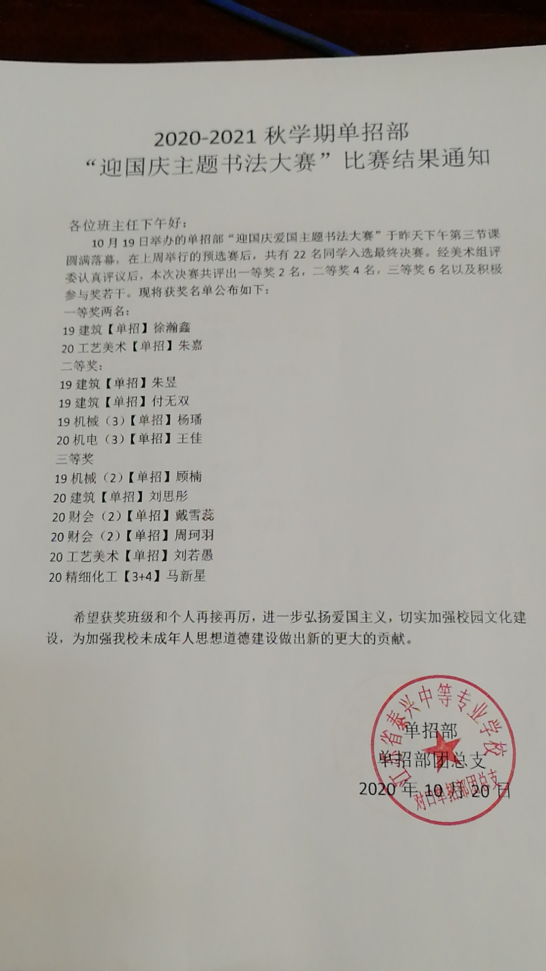 10月19日下午4点,我系于6号阶梯教室举行了“不忘历史,振兴中华”主题书法大赛的最终决赛,经过半小时的奋笔书写,本次比赛圆满落幕。经过上周预选赛选拔,共有22名学生入选最终决赛。经美术组评委认真评议,本次决赛共评出一等奖2队,二等奖4队,三等奖6队以及积极参与奖若干。现将获奖名单公布如下: