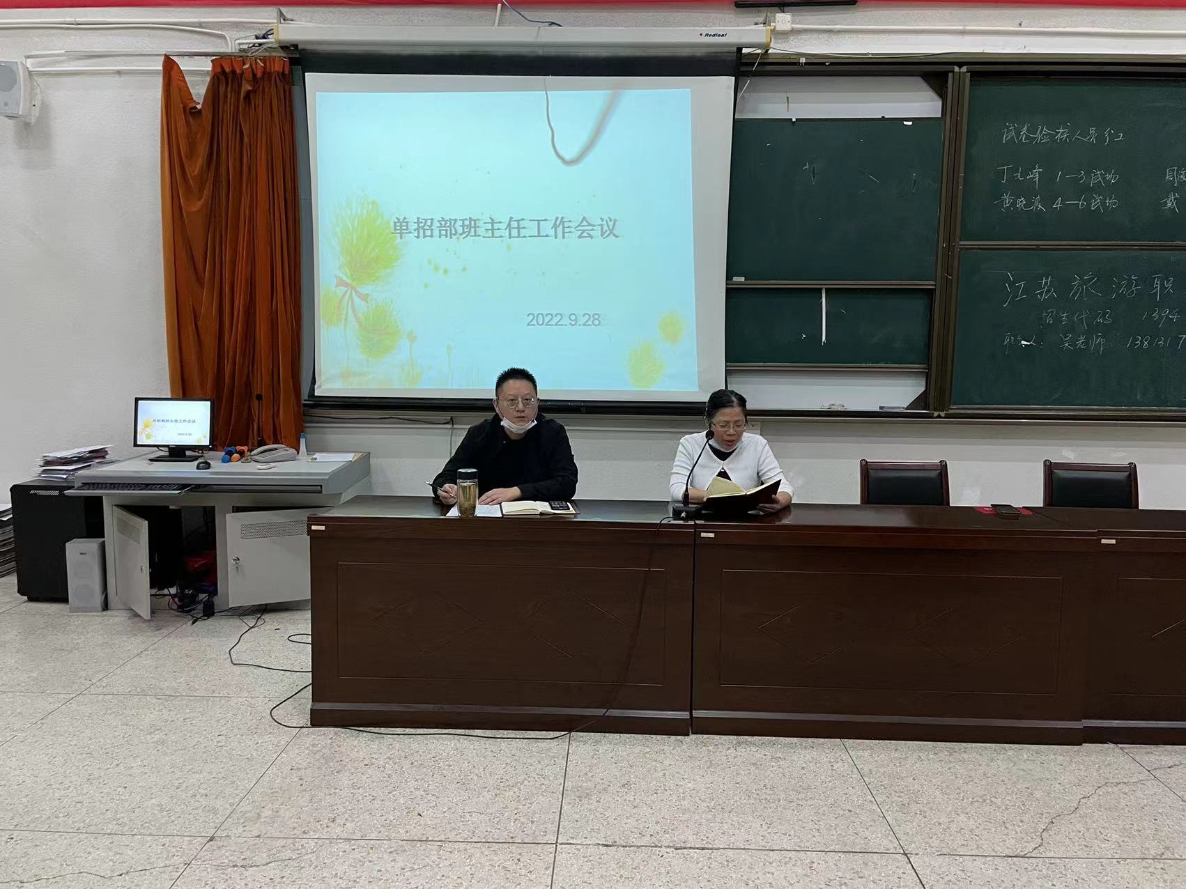 9月28号下午四点半在六号楼阶梯教室召开单招部全体班主任工作会议。会议主要内容1.学测报名2.安全问题3.下周一开始跑操4.学生胸卡问题5.请假条规范(存根)6.核酸检测排队纪律7.不得体罚学生8.三检表(消毒通风记录表、体温表、点名册)延时补课期间及时上报9.卫生问题(宿舍卫生)10.学生非必要不得离泰11.头盔问题12.收缴各项资料要及时13.国庆放假时间(四号早上收齐48小时内核酸)。