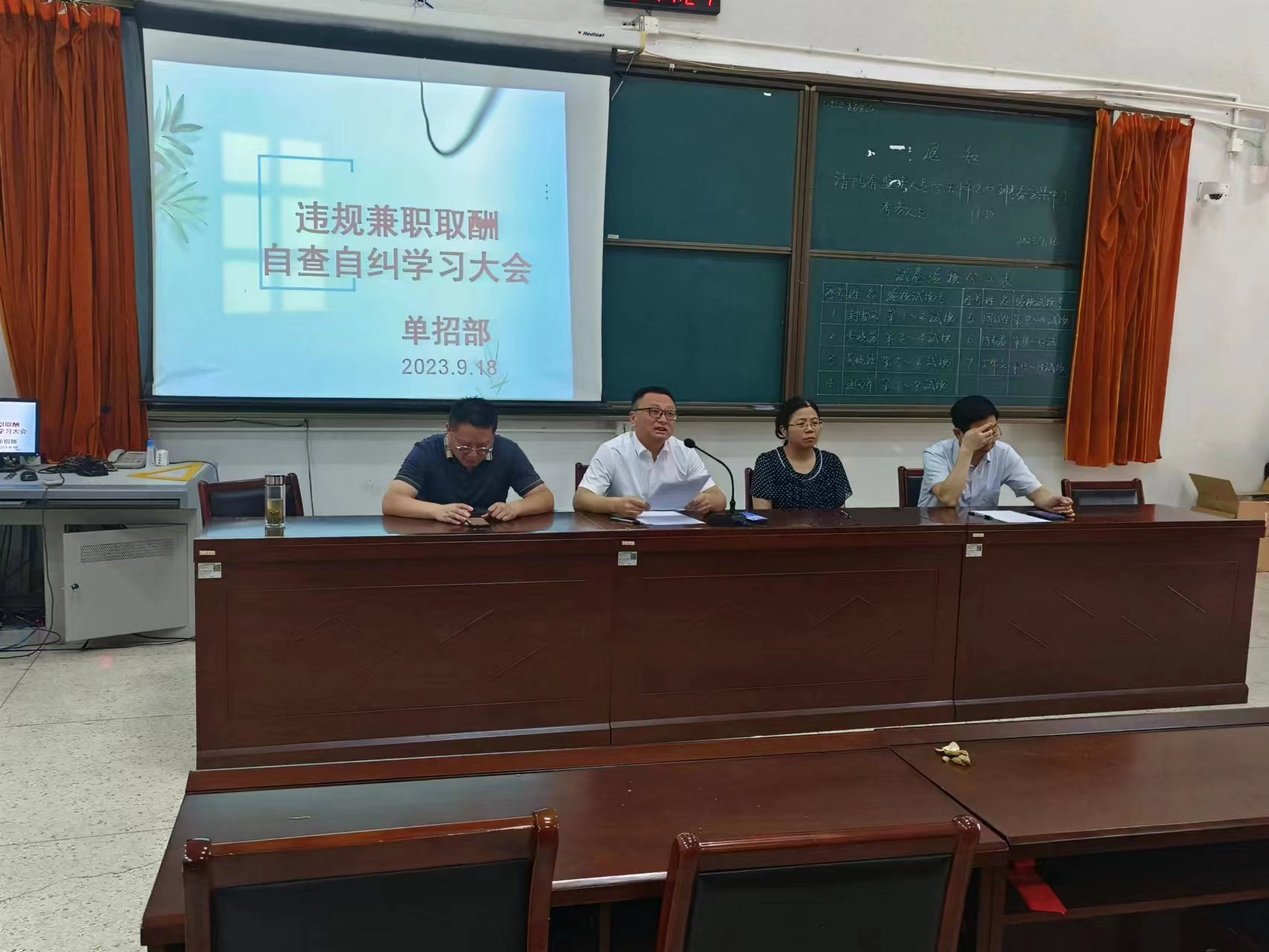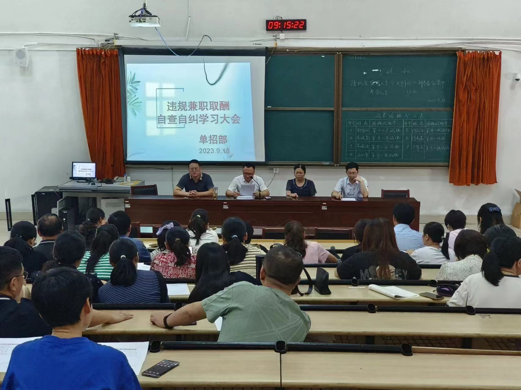 2023年9月18日上午9点,单招部在6号楼阶梯教师学习《关于对教师李鹏违法犯罪问题查处情况的通报》。会上,叶开进主任要求单招部所有教职员工要从中吸取教训,引以为戒,并要求所有教职员工认真如实填写好《在职教师违规兼职取酬自查自纠表》,不得弄虚作假。