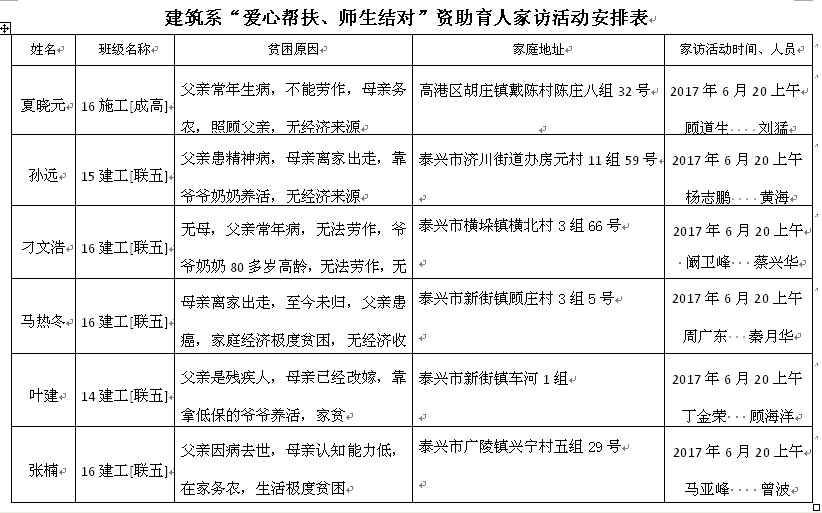 在校党委、学工处的部署下, 丁金荣副校长一行深入结对帮扶贫困生家中,与学生家长面对面交谈,首先,详细了解他们的家庭情况、健康状况、经济来源、子女上学和生活开支等情况,以及目前存在的困难和问题。然后,把学生在校期间的学习和生活中的表现反馈给家长,鼓励学生树立信心、克服困难、学好技能、改变命运。 对于困难家庭的学生,及时予以备案,对存在的困难和问题,系党支部书记周广东要求,每位教师党员要想学生之所想,急学生之所急,充分发挥党员作用,积极帮助贫困学生出主意、想办法、送政策、送技术,全身心为帮扶学生服务。此次走访,不仅及时将市政府的学生资助政策宣传到位,让学校老师更真实了解学生的家庭情况,而且进一步拉近了教师与学生的距离,增进了感情、收获了信任,受到家长的欢迎和肯定,奠定了“爱心帮扶、师生结对”活动的基础。