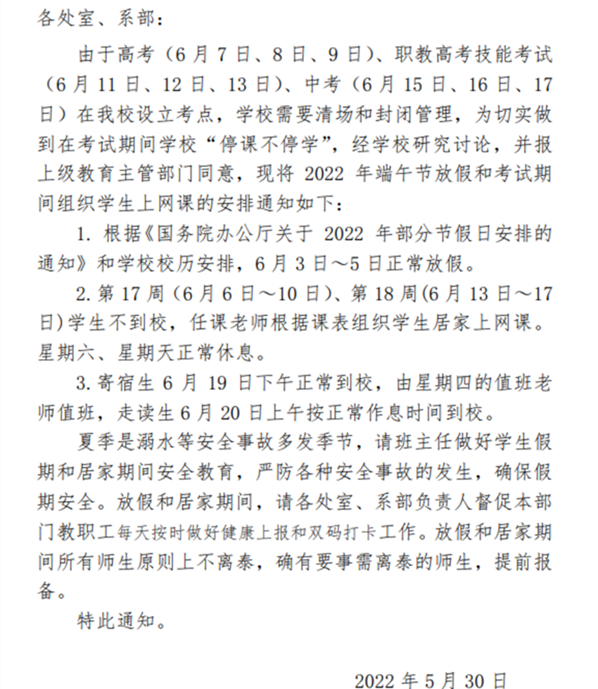 关于端午节放假和 17 周、18 周组织学生网上学习的通知