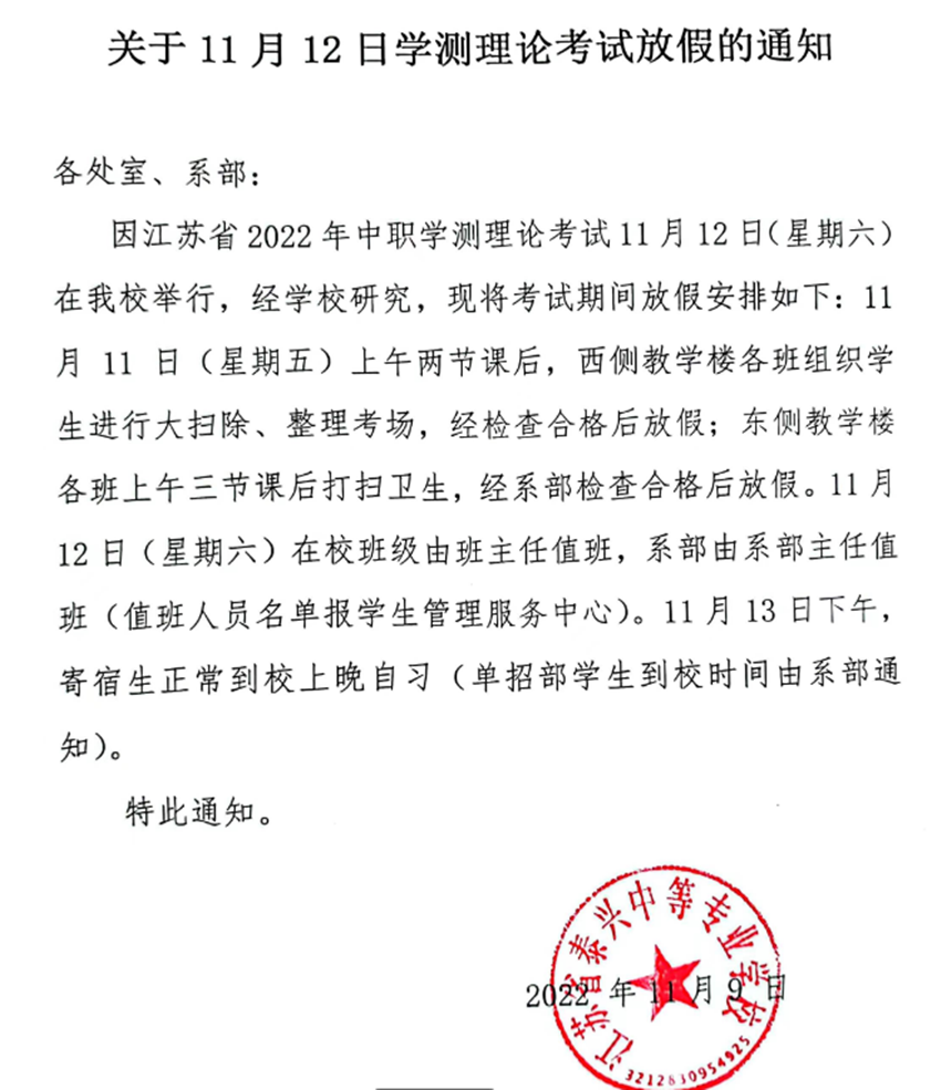 关于11月12日学测理论考试放假的通知