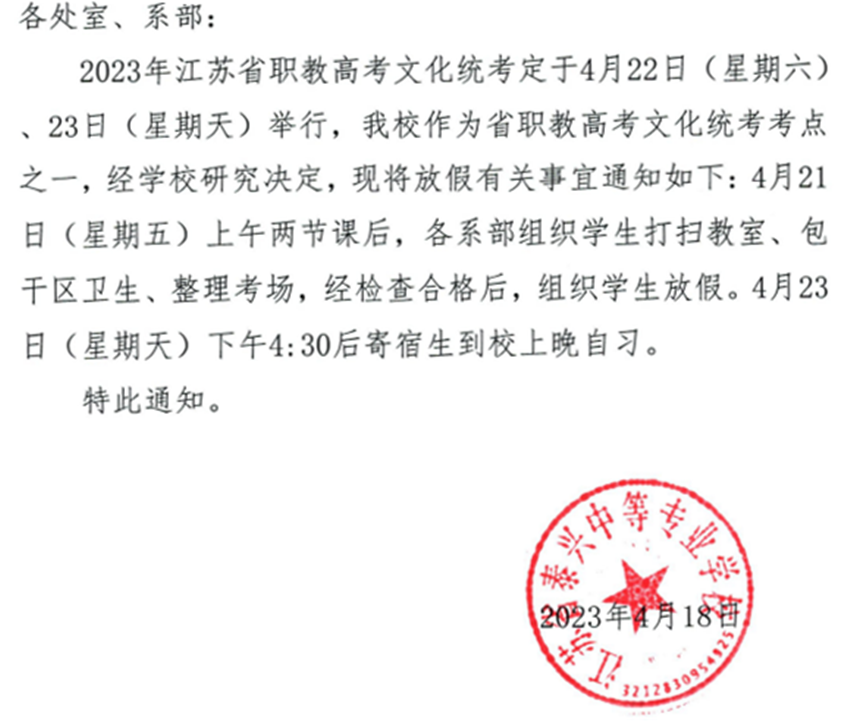 关于 2023年职教高考文化统考期间放假的通知